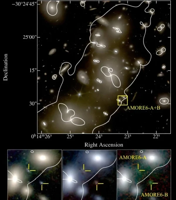 С помощью космического телескопа Уэбб астрономы впервые обнаружили галактику, получившую название AMORE6, которая может быть первозданной, "чистой" галактикой, в которой нет химических элементов, тяжелее гелия и водорода. То есть она, как считают ученые, имеет нулевую металличность. Это открытие подтверждает теорию Большого взрыва. Исследование опубликовано на сервере препринтов arXiv, пишет SciTechDaily. Первые химические элементы во ВселеннойВо время Большого взрыва, когда Вселенная начала стремительно расширяться, были созданы первые и самые легкие химические элементы: водород, гелий и крошечное количество лития. Более тяжелые химические элементы, которые астрофизики называют металлами, были созданы позже в недрах первых звезд, известных как звезды Населения III. Эти звезды состояли только из водорода и гелия и имели нулевую металличность. Когда эти звезды взорвались сверхновыми, то они наполнили космос тяжелыми химическими элементами. Поскольку звезды рождаются в галактиках, должны были существовать галактики Населения III, которые не содержали металлов. Их существование было бы подтверждением современной космологической модели, описывающей появление и эволюцию Вселенной. Но до сих пор астрономы не находили галактик с нулевой металличностью. Галактика без металловС помощью космического телескопа Уэбб астрономы впервые обнаружили галактику, получившую название AMORE6, которая может быть первозданной, "чистой" галактикой, в которой нет химических элементов, тяжелее гелия и водорода. Она подвергает то, что галактики Населения III существовали, а также подтверждает теорию Большого взрыва. Астрономы говорят, что эта галактика содержит практически первозданную межзвездную среду. Характеристики AMORE6 соответствует модели образования самых первых звезд. Галактика AMORE6 существовала через 900 миллионов – 1 миллиард лет после Большого взрыва. Это значит, что ее свет летел к нам почти 13 миллиардов лет. В галактике астрономы обнаружили относительно мало звезд, а потому она имеет малую звездную массу. Также AMORE6 является компактной галактикой. Эти свойства согласуются с образованием звезд в первозданной среде, лишенной металлов, говорят астрономы. Подтверждением теории Большого взрываЭта галактика не такая старая, как некоторые более ранние, полностью сформировавшиеся галактики, обнаруженные до этого в ранней Вселенной. Астрономов немного удивляет то, что эта галактика, лишенная металлов, существовала почти через миллиард лет после Большого взрыва. По словам ученых, открытие AMORE6 является подтверждением теории Большого взрыва. Многие годы астрономы предполагали, что ранние галактики формировались в условиях, которые существенно отличаются от современных. Низкая металличность AMORE6 напрямую подтверждает эти предположения. И все же для подтверждения результатов исследования нужны более детальные наблюдения. | |