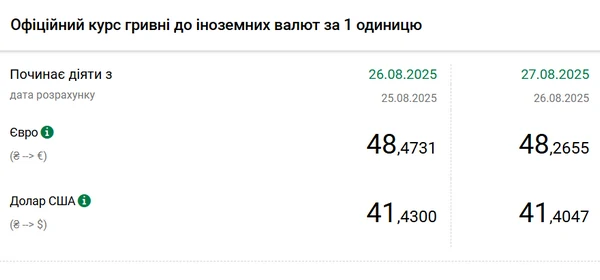 Национальный банк Украины (НБУ) снизил курс доллара к гривне. Европейская валюта также подешевела. Об этом сообщает РБК-Украина со ссылкой на данные на сайте регулятора. Официальный курс на 27 августа 2025 года установлен на таком уровне: 41,4047 гривен за 1 доллар (-0,0253 грн). Официальный курс евро составит 48,2655 гривен за 1 евро (-0,2076 грн).