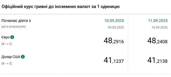 Национальный банк Украины (НБУ) повысил курс доллара к гривне. Доллар подорожал после снижения до минимума с начала апреля. Об этом сообщает РБК-Украина со ссылкой на данные на сайте регулятора. Официальный курс на 11 сентября 2025 года установлен на таком уровне: 41,2138 гривен за 1 доллар (+0,0901 грн). Официальный курс евро составит 48,2408 гривен за 1 евро (-0,0508 грн).