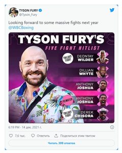 Похоже, что чемпион мира в супертяжелом весе по версии WBC Тайсон Фьюри не сильно стремится к поединкам с Александром Усиком. По неизвестным причинам британский боксер не включил украинца в список желаемых соперников на следующий год.В своем Twitter-аккаунте он разместил имена боксеров, с которыми хотел бы встретится и пописал пост: "С нетерпением жду крупных боев в следующем году". Возглавляет список Деонтей Уайлдер, которого Фьюри уже победил в 2021 году. Далее идет претендент на пояс WBC Диллиан Уайт. Кроме того, в 2022-м Фьюри хотел бы дважды подраться с Энтони Джошуа. А замыкает список Дерек Чисора, у которого Тайсон выиграл уже в двух боях в 2011 и 2014 годах. | |