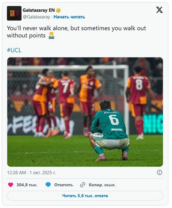 Прошло не так много времени, как турецкий футбольный клуб Галатасарай в матче второго тура общего этапа Лиги чемпионов выиграл игру у Ливерпуля. Выиграна встреча была с минимальным счетом 1:0. На волне эйфории от успеха в домашнем матче, проведенном в рамках розыгрыша Лиги чемпионов, Галатасарай прибегнул в соцсетях к ироничному прославлению своей победы, несколько уничижительно отозвавшись о соперниках. В частности, в соцсети Х турецкий клуб в англоязычной версии своего аккаунта опубликовал сообщение, обращенное к игрокам Ливерпуля и в котором были обыграны слова из гимна английской команды: You'll never walk alone. "Ты никогда не будешь одинок на своем пути, но иногда ты идешь прочь без очков", - сказано в сообщении. | |