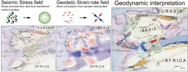 Результаты указывают на то, что поля напряжений и деформаций в этой среде были рассчитаны с использованием данных о деформациях, полученных со спутника, и данных о землетрясениях, произошедших в последние годы. Далее команда сравнила два этих аспекта и теперь ученые утверждают, что они более полно понимают геодинамические и тектонические процессы. Ученым также удалось получить больше новых данных о границе между Евразийской и Африканской плитами. В результате им удалось выяснить, какие участки на границе уже находятся под влиянием столкновения Евразийской и Африканской плит, а какие все еще определяются западным смещением Гибралтарской дуги. По словам Мадариета, новые данные также подтверждают, что Иберийский полуостров вращается по часовой стрелка. Более того, данные указывают на то, что Гибралтарская дуга играет значительную роль на границе Евразии и Африки. К востоку от Гибралтарского пролива кора Гибралтарской дуги поглощает деформацию, вызванную столкновением Евразии и Африки, тем самым предотвращая передачу напряжений на Иберию. С другой стороны, к западу от Гибралтарского пролива происходит прямое столкновение Иберийской (Евроазийской) и Африканской плит. Авторы считают, что это также может повлиять на передачу напряжений к юго-западу от Иберии, толкая Иберию с юго-запада и заставляя ее вращаться по часовой стрелке. Отметим, что в Иберии много мест, где наблюдается значительные деформации или происходят землетрясения, однако ученым все еще неизвестно, какие тектонические структуры там активны. Эти поля напряжений и деформаций подсказывают, куда нужно отправиться, чтобы искать эти структуры. Ученые считают, что в будущем им удастся выяснить, какие складки и разломы могут существовать, каково их движение, какие землетрясения они могут вызывать и какой магнитуды. | |