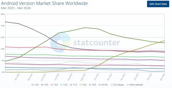 Свежие данные показывают, что Android 16 обошла по популярности предыдущую версию (15) и стала самой популярной ОС