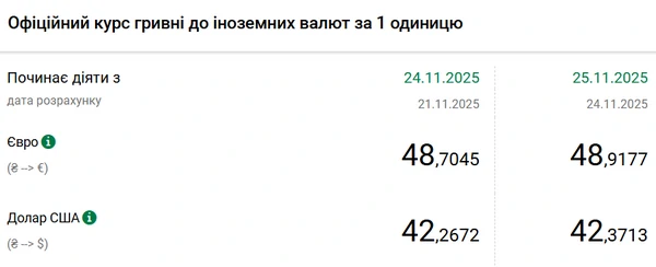 Национальный банк Украины (НБУ) повысил курс доллара к гривне. Стоимость валюты США увеличилась на 11 копеек и обновила исторический максимум. Об этом сообщает РБК-Украина со ссылкой на данные на сайте регулятора. Официальный курс доллара на 25 ноября 2025 года составляет 42,3713 гривны за единицу валюты. Это является историческим максимумом для стоимости валюты США по отношению к гривне. Предыдущий рекорд был установлен 13 января 2025 года, когда курс достигал 42,28 гривны. С начала 2025 года доллар прибавил в цене 35 копеек: 1 января его стоимость составляла 42,02 гривны. С начала ноября американская валюта выросла еще на 40 копеек – в первый день месяца курс был на уровне 41,97 гривны за доллар. Официальный курс евро на 25 ноября составляет 48,9177 гривны. Европейская валюта также укрепилась: по сравнению с показателем на 24 ноября ее цена выросла на 21 копейку.