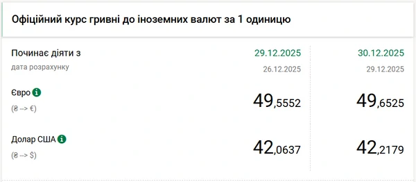 Национальный банк Украины (НБУ) увеличил курс доллара к гривне — на 15 копеек. Об этом сообщает РБК-Украина со ссылкой на данные на сайте регулятора. Официальный курс доллара на 30 декабря 2025 года установлен на таком уровне: 42,2179 гривен за 1 доллар (+0,15 грн). Официальный курс евро составляет 49,6525 гривен за 1 евро (+0,10 грн).
