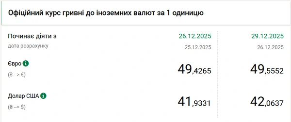 Национальный банк Украины (НБУ) увеличил курс доллара к гривне — на 13 копеек. Об этом сообщает РБК-Украина со ссылкой на данные на сайте регулятора. Официальный курс доллара на 29 декабря 2025 года установлен на таком уровне: 42,0637 гривен за 1 доллар (+0,13 грн). Официальный курс евро составляет 49,5552 гривен за 1 евро (+0,13 грн).