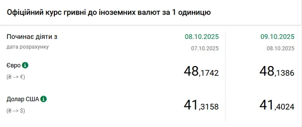 Национальный банк Украины (НБУ) повысил курс доллара к гривне – на 9 копеек. Об этом сообщает РБК-Украина со ссылкой на данные на сайте регулятора. Официальный курс доллара на 9 октября 2025 года установлен на таком уровне: 41,4024 гривен за 1 доллар (+0,09 грн). Официальный курс евро составляет 48,1386 гривен за 1 евро (-0,04 грн).