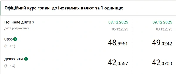 Национальный банк Украины (НБУ) повысил курс доллара к гривне – на 1 копейку. Об этом сообщает РБК-Украина со ссылкой на данные на сайте регулятора. Официальный курс доллара на 9 декабря 2025 года установлен на таком уровне: 42,0700 гривен за 1 доллар (+0,01 грн). Официальный курс евро составляет 49,0242 гривен за 1 евро (+0,06 грн).