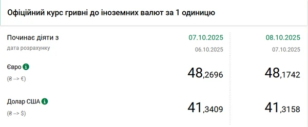 Национальный банк Украины (НБУ) снизил курс доллара к гривне – на 2 копейки. Об этом сообщает РБК-Украина со ссылкой на данные на сайте регулятора. Официальный курс доллара на 8 октября 2025 года установлен на таком уровне: 41,3158 гривен за 1 доллар (-0,03 грн). Официальный курс евро составляет 48,1742 гривен за 1 евро (-0,10 грн).
