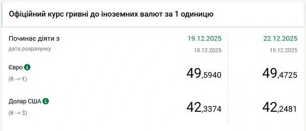 Национальный банк Украины (НБУ) снизил курс доллара к гривне — на 9 копеек. Об этом сообщает РБК-Украина со ссылкой на данные на сайте регулятора. Официальный курс доллара на 22 декабря 2025 года установлен на таком уровне: 42,2481 гривен за 1 доллар (-0,09 грн). Официальный курс евро составляет 49,4725 гривен за 1 евро (-0,12 грн).