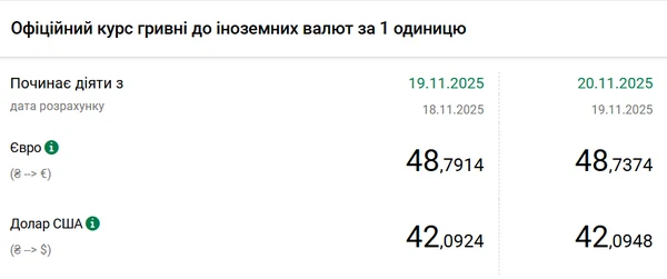 Национальный банк Украины (НБУ) практически не изменил курс доллара к гривне. Стоимость валюты США осталась на уровне 19 ноября. Об этом сообщает РБК-Украина со ссылкой на данные на сайте регулятора. Официальный курс доллара на 20 ноября 2025 года установлен на таком уровне: 42,0948 гривны за 1 доллар. С начала года курс года курс доллара повысился на 7 копеек. 1 января 2025 года американская валюта стоила 42,02 гривны. При этом с 1 ноября курс доллара стал больше на 12 копеек. В начале месяца его стоимость составляла 41,97 гривны. Официальный курс евро на 20 ноября составляет 48,7374 гривны. Единая европейская валюта подешевела. По сравнению с 19 ноября ее стоимость понизилась на 6 копеек.