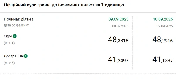 Национальный банк Украины (НБУ) снизил курс доллара к гривне. Единая европейская валюта также подешевела. Об этом сообщает РБК-Украина со ссылкой на данные на сайте регулятора. Официальный курс на 10 сентября 2025 года установлен на таком уровне: 41,1237 гривен за 1 доллар (-0,1260 грн). Ниже в 2025 году курс был только 8 апреля 41,0807 грн/доллар. За последний год курс не изменился. Курс НБУ на 10 сентября 2025 года составлял 41,0948 грн/доллар. Официальный курс евро составит 48,2916 гривен за 1 евро (-0,0902 грн).