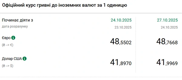Национальный банк Украины (НБУ) повысил курс доллара к гривне. Доллар подорожал до максимума с конца января. Об этом сообщает РБК-Украина со ссылкой на данные на сайте регулятора. Официальный курс на 27 октября 2025 года установлен на таком уровне: 41,9969 гривен за 1 доллар (+0,0999 грн). Выше курс был только 29 января 2025 года - 42,0195 грн/доллар. Официальный курс евро составит 48,7668 гривен за 1 евро (+0,2166 грн).