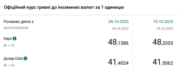 Национальный банк Украины (НБУ) повысил курс доллара к гривне – на 10 копеек. Об этом сообщает РБК-Украина со ссылкой на данные на сайте регулятора. Официальный курс доллара на 10 октября 2025 года установлен на таком уровне: 41,5062 гривен за 1 доллар (+0,10 грн). Официальный курс евро составляет 48,2053 гривен за 1 евро (+0,07 грн).
