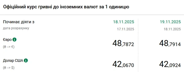 Национальный банк Украины (НБУ) повысил курс доллара к гривне. Валюта США подорожала на 3 копейки. Об этом сообщает РБК-Украина со ссылкой на данные на сайте регулятора. Официальный курс доллара на 19 ноября 2025 года установлен на таком уровне: 42,0924 гривны за 1 доллар (+0,03 грн). С начала года курс года курс доллара повысился на 7 копеек. 1 января 2025 года американская валюта стоила 42,02 гривны. При этом с 1 ноября курс доллара стал больше на 12 копеек. В начале месяца его стоимость составляла 41,97 гривны. Официальный курс евро на 19 ноября составляет 48,7914 гривны. Единая европейская валюта также немного подорожала. По сравнению с 18 ноября ее стоимость увеличилась на 1 копейку.