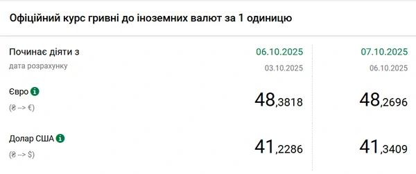 Национальный банк Украины (НБУ) повысил курс доллара к гривне – на 11 копеек. Об этом сообщает РБК-Украина со ссылкой на данные на сайте регулятора Официальный курс доллара на 7 октября 2025 года установлен на таком уровне: 41,3409 гривен за 1 доллар (+0,1123 грн). Официальный курс евро составляет 48,2696 гривен за 1 евро (-0,1122 грн).
