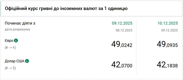 Национальный банк Украины (НБУ) повысил курс доллара к гривне – на 11 копеек. Об этом сообщает РБК-Украина со ссылкой на данные на сайте регулятора. Официальный курс доллара на 10 декабря 2025 года установлен на таком уровне: 42,1838 гривен за 1 доллар (+0,11 грн). Официальный курс евро составляет 49,0935 гривен за 1 евро (+0,07 грн).