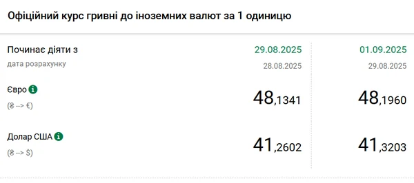 Национальный банк Украины (НБУ) повысил курс доллара к гривне. Единая европейская валюта также подорожала. Об этом сообщает РБК-Украина со ссылкой на данные на сайте регулятора. Официальный курс на 1 сентября 2025 года установлен на таком уровне: 41,3203 гривен за 1 доллар (+0,0601 грн). Официальный курс евро составит 48,196 гривен за 1 евро (+0,0619 грн).