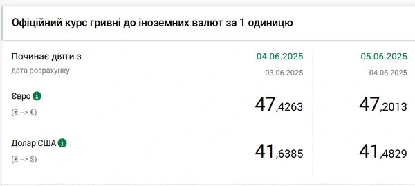 Национальный банк Украины (НБУ) снизил курс доллара к гривне. Доллар подешевел после двух дней роста. Об этом сообщает РБК-Украина со ссылкой на данные на сайте регулятора. Официальный курс на 5 июня 2025 года установлен на таком уровне: 41,4829 гривен за 1 доллар (-0,1556 грн). Официальный курс евро составит 47,2013 гривен за 1 евро (-0,2250 грн).