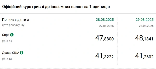 Национальный банк Украины (НБУ) снизил курс доллара к гривне на последний рабочий день августа. За месяц доллар подешевел на 50 копеек. Об этом сообщает РБК-Украина со ссылкой на данные на сайте регулятора. Официальный курс на 29 августа 2025 года установлен на таком уровне: 41,2602 гривен за 1 доллар (-0,0620 грн). Официальный курс евро составит 48,1341 гривен за 1 евро (0,2541 грн).