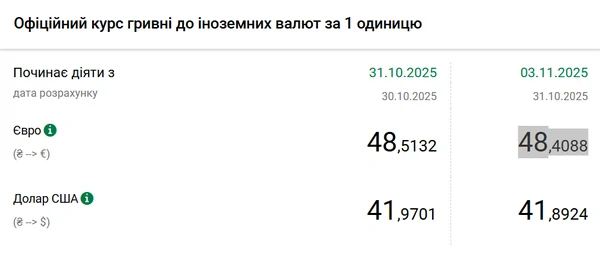 Национальный банк Украины (НБУ) понизил курс доллара к гривне – на 8 копеек. Об этом сообщает РБК-Украина со ссылкой на данные на сайте регулятора. Официальный курс доллара на 3 ноября 2025 года установлен на таком уровне: 41,8924 гривны за 1 доллар (-0,08 грн). НБУ третий день подряд снижает курс американской валюты после того как 29 октября доллар в Украине подорожал до максимума с января этого года. В тот день его стоимость составила 42,08 грн. С начала года курс года курс доллара снизился на 13 копеек. 1 января 2025 года американская валюта стоила 42,02 гривны. При этом с 1 октября доллар вырос 75 копеек. В начале месяца его стоимость составляла 41,14 гривны. Официальный курс евро на 3 ноября составляет 48,4088 гривны. Единая европейская валюта также подешевела. Ее курс снизился на 11 копеек.