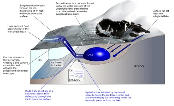 Более 10 лет назад в Гренландии произошло беспрецедентное событие: 90 миллионов кубометров талой воды из-под ледяного щита пробились на поверхность, вместо того чтобы стекать в океан. Это явление объяснили ученые в Nature Geoscience. Они сделали открытие, что заставляет пересмотреть модели таяния ледников. Явление зафиксировали с помощью спутниковых данных NASA и ESA. По словам ученых, оно указывает на то, что климатические изменения могут влиять на таяние Гренландии быстрее, чем считалось. Согласно схеме, иллюстрирующей процесс, приведший к прорыву щита, становится понятным, что вода в результате таяния накопилась под ледником, создала значительное давление, а затем фактически нашла слабое место и из-за трещин прорвалась вверх, залив водой огромную территорию.