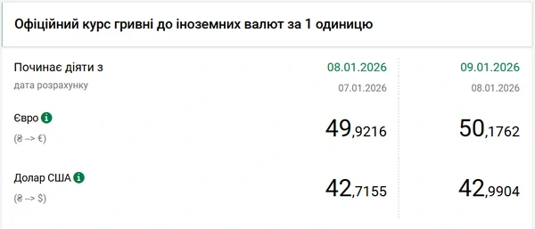 Национальный банк повысил официальный курс доллара на 9 января на 27 копеек — до 42,99 гривен, а курс евро на 25 копеек — до 50,18 гривен, эти значения являются рекордными для украинского валютного рынка. Об этом сообщает РБК-Украина со ссылкой на данные на сайте регулятора. Официальный курс доллара на 9 января установлен на уровне 42,9904 гривен, а евро — 50,1762 гривен. Официальный курс доллара c 1 января 2026 года вырос на 64 копеек, а курс евро — на 39 копеек.