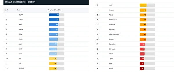 Исследование показало, что гибридные авто сейчас надежнее бензиновых — у них зафиксировано на 15% меньше неисправностей. А вот плагин-гибриды и электромобили, наоборот, менее надежны и у них на 80% больше проблем. Самые надежные авто на рынке — японского производства. Страну Восходящего Солнца в топ 10 представляют сразу шесть брендов, а лидерами рейтинга являются Toyota, Subaru и Lexus. Наиболее проблемными признали Ram и Rivian. А вот Tesla, которая ранее также была внизу рейтинга, неожиданно поднялась на 9 место. Названы и самые надежные модели авто от разных автопроизводителей: