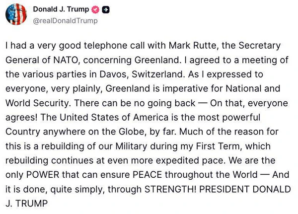 Президент США Дональд Трамп анонсировал проведение отдельной встречи в Давосе по Гренландии. Это произошло после телефонного разговора с генеральным секретарем НАТО Марком Рютте. Об этом сообщает РБК-Украина со ссылкой на его пост в соцсети Truth Social. По словам Трампа, во время разговора с генсеком НАТО он согласился организовать встречу с участием различных сторон в рамках Всемирного экономического форума в Швейцарии. Главной темой станет ситуация вокруг Гренландии.