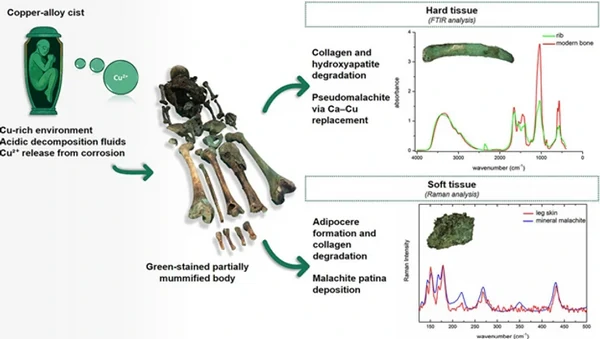 Со временем, по мере разложения тела, кислотные жидкости вступали в реакцию с металлическими стенками гроба, образуя продукты коррозии меди, такие как малахит и псевдомалахит. Эти минералы проникали в ткани, заменяя кальций путем ионной замены и оставляя останки навсегда окрашенными в зеленые тона. Подросток был похоронен в гробу из медного сплаваКислотные жидкости вступали в реакцию с металлическими стенками гроба, образуя продукты коррозии меди, такие как малахит и псевдомалахит Одна загадка все еще интриговала исследователей: отсутствие окраски на левой ноге. Команда пришла к выводу, что трещина в основании гроба позволила жидкости стекать, предотвращая прямой контакт между этой ногой и коррозионной медью. Химические тесты не выявили никаких заболеваний или травм, что свидетельствует о том, что причина смерти остается неизвестной. Однако наличие дорогого медного гроба стоимостью около 260 000 долларов по современным ценам указывает на то, что подросток происходил из состоятельной семьи. Это исследование не только решило древнюю загадку, но и предоставило ценную информацию о том, как материалы захоронения влияют на человеческие останки. Мумия из Болоньи является самым полным примером мумификации под воздействием меди, который когда-либо был задокументирован, превосходя предыдущие частичные открытия. | |