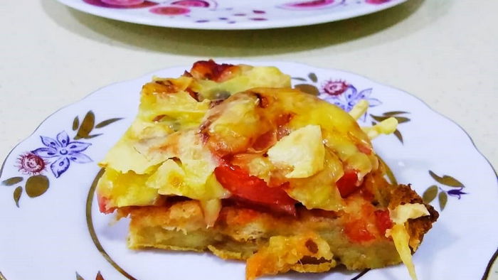 - Сверху выложить овощи, колбасу, оливки, полить томатным соусом и посыпать сыром.