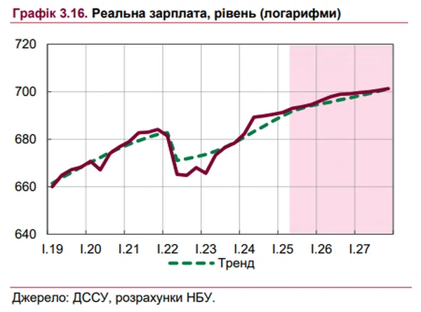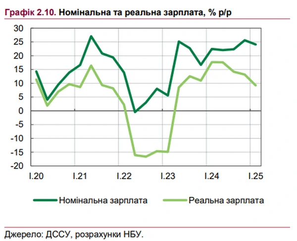 Зарплаты украинцев в 2024 году выросли на 23%. НБУ ожидает, что темпы постепенно замедлятся, но останутся высокими. Об этом сообщает РБК-Украина со ссылкой на "Инфляционный отчет" Национального банка Украины (июль 2025 года). Согласно обновленному макропрогнозу НБУ, в 2025 году средняя зарплата украинцев вырастет на 19,0%. Однако средняя инфляция за год составит 13,3%. Это приведет к тому, что реальная зарплата вырастет на 5,2%. Как отмечается в обзоре, рост реальных зарплат замедлился до 9,2% г/г в I квартале 2025 года; на основе высокочастотных косвенных показателей, замедление продолжалось и во II квартале. Ослабился в реальном измерении и ряд других доходов населения (в частности социальные выплаты и пенсии). "Реальные зарплаты будут расти и в дальнейшем в условиях преобладания спроса над предложением рабочей силы и общего оживления экономической активности. Однако меньшими темпами (на 4-5% в год), учитывая постепенное выравнивание дисбалансов на рынке труда и неценовую конкуренцию работодателей", - говорится в обзоре. Согласно прогнозу НБУ, длительный миграционный отток и медленное возвращение мигрантов будут обусловливать сохранение дефицита рабочей силы и ее существенную неравномерность по видам деятельности и регионам. Это будет сдерживать восстановление экономики и стимулировать дальнейшее увеличение зарплат более высокими темпами, чем рост производительности, что будет усиливать инфляционное давление. Обновленный прогноз НБУПо данным НБУ, средняя номинальная зарплата в Украине в 2023 году выросла на 17,4%, а реальная (с учетом инфляции) на 3,7%. В 2024 году номинальная зарплата выросла на 23,2%, реальная - на 15,6%.