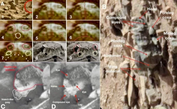 Анатомические структуры, наблюдаемые на этих изображениях, такие как сложные глаза и специализированные конечности, соответствуют членистоногим — большой группе, в которую входят насекомые. Ромозер также отметил следующее: "Наблюдаемая фауна, похожая на насекомых, по-видимому, укрывается/гнездится в пещерах, в норах под поверхностью и в специализированных структурах". Свидетельства наличия рептилиеподобных существ на МарсеРомозер также обнаружил среди фотографий марсохода то, что он считает окаменелостями рептилий. Одна из его ключевых находок касается образца, имеющего сходство с восточной королевской змеей, с отчетливой головой и двусторонними точечными структурами. Окаменелое существо, судя по всему, имеет большую пасть, способную широко раскрываться, что дополнительно подтверждает гипотезу о том, что рептилиеподобные организмы когда-то существовали или могут существовать на Марсе до сих пор. Обнаруженные формы, похожие на рептилий, демонстрируют симметрию и анатомические черты, параллельные земным рептилиям. Эти наблюдения привели Ромозера к предположению, что Марс мог поддерживать или все еще может поддерживать формы жизни, подобные земным. На некоторых изображениях рептилиеподобные существа, похоже, охотятся на насекомоподобные организмы. Астробиология стала намного интереснееПоследствия исследований Ромозера выходят за рамки открытия этих форм жизни. Он предполагает, что его находки могут дать начало новым направлениям науки.