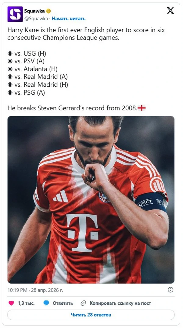 Нападающий Баварии Гарри Кейн смог забить голы в шести матчах Лиги чемпионов подряд, в результате чего обошел Стивена Джеррарда. Отмечается, что среди футболистов сборной Англии только легенда Ливерпуля Стивен Джеррард мог похвастаться такой долгой серией забитых голов в Лиге чемпионов. Экс-нападающий мерсисайдцев в 2008 году отличился в пяти играх подряд, что считалось рекордом среди игроков "трех львов", однако теперь новым обладателем данного достижения стал Гарри Кейн. Напомним, что форвард Баварии в полуфинальном поединке ЛЧ против ПСЖ реализовал пенальти. Этот гол стал шестым для англичанина, и за последние шесть матчей Лиги чемпионов он забил 8 мячей. | |